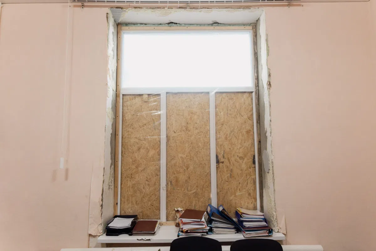 В одному з кабінетів осколок пробив пластикову віконну раму і застряг у протилежній стіні. Працівники кажуть — у закладі такого багато. Загалом майже неушкодженими залишилися лише два кабінети, один з них — директора.
