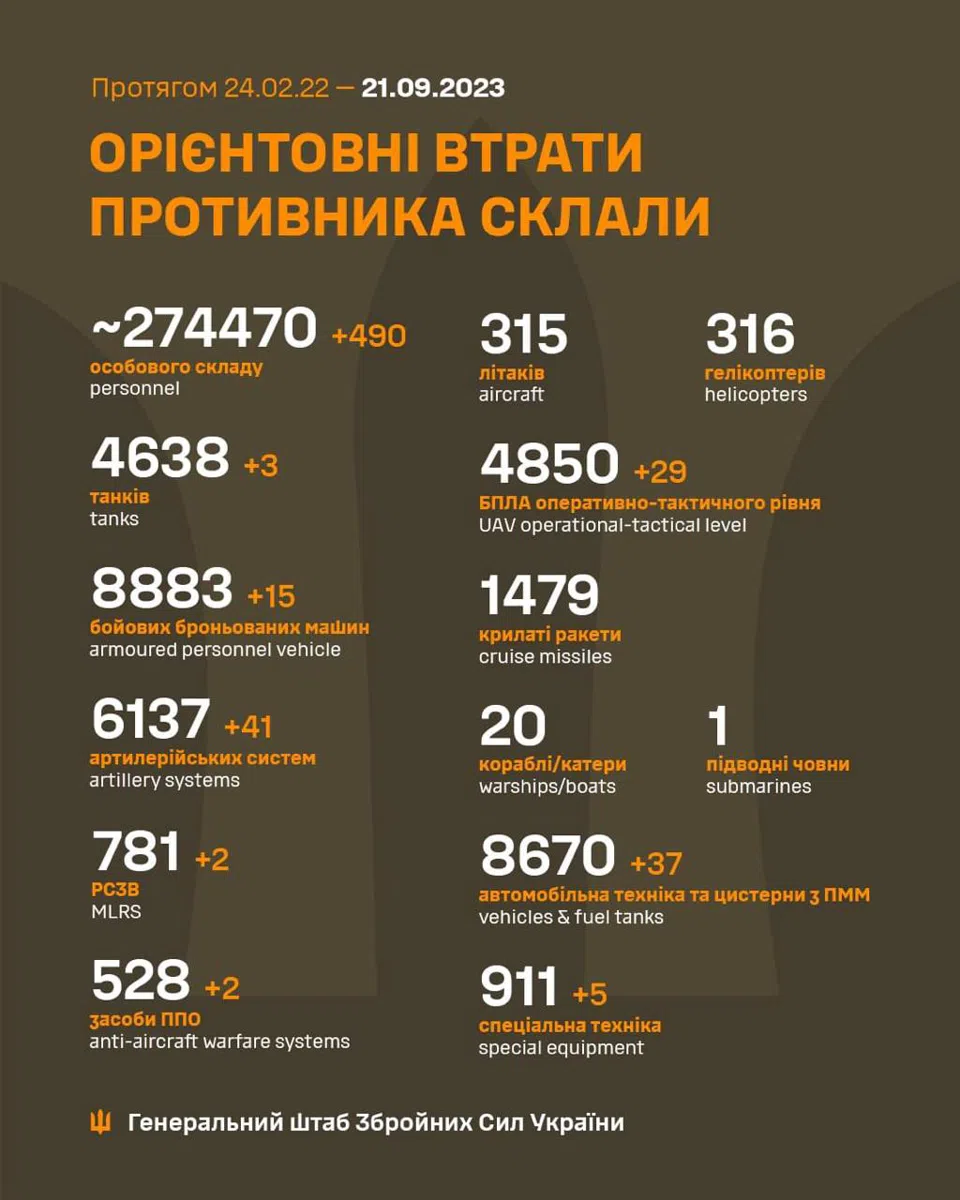 Загальні бойові втрати ворога станом на ранок 21 вересня: