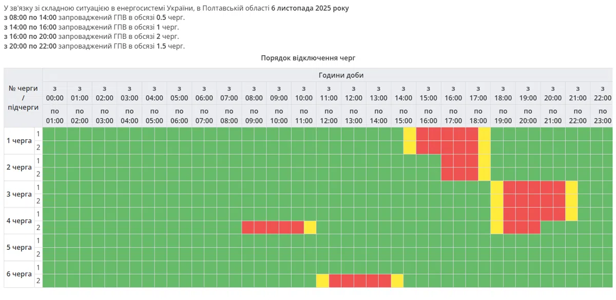 6 листопада у Полтавській області ввели графіки погодинних відключень електроенергії. Їх запроваджують через дефіцит потужності в енергосистемі, через російські обстріли.