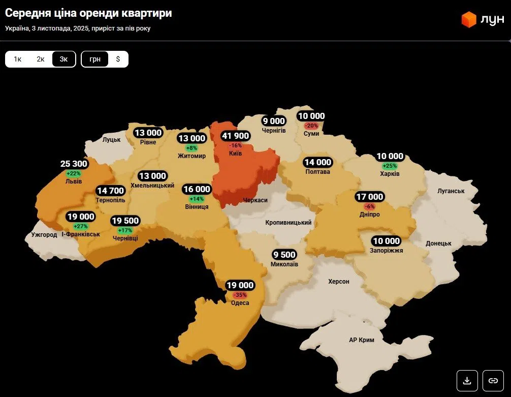 Станом на початок листопада 2025 року оренда трикімнатних квартир в Україні змінилася нерівномірно. Наприклад, в Києві зняти "трьошку" стало дещо дешевше (на 16%), при цьому значно піднялися ціни у Харкові (+25%), Івано-Франківську (+27%) та Львові (+22%).
