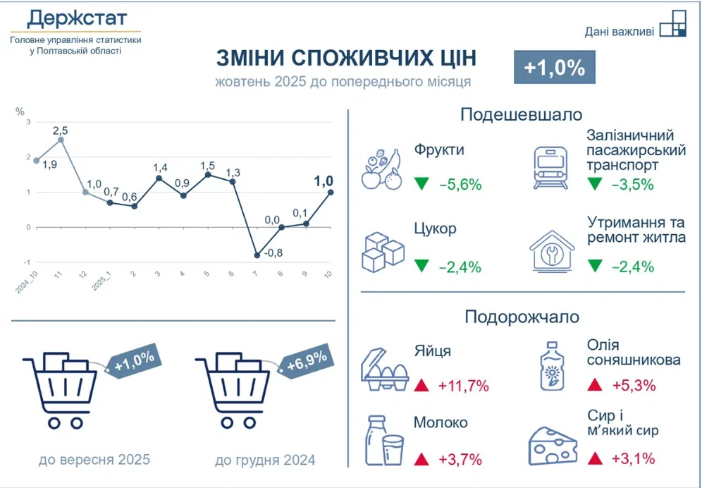 Ціни на споживчому ринку Полтавщини в жовтні 2025 року порівняно з попереднім місяцем зросли на 1%, з початку року – на 6,9% (по Україні – на 0,9% та 7,3% відповідно). Про це повідомили у Полтавській ОВА.