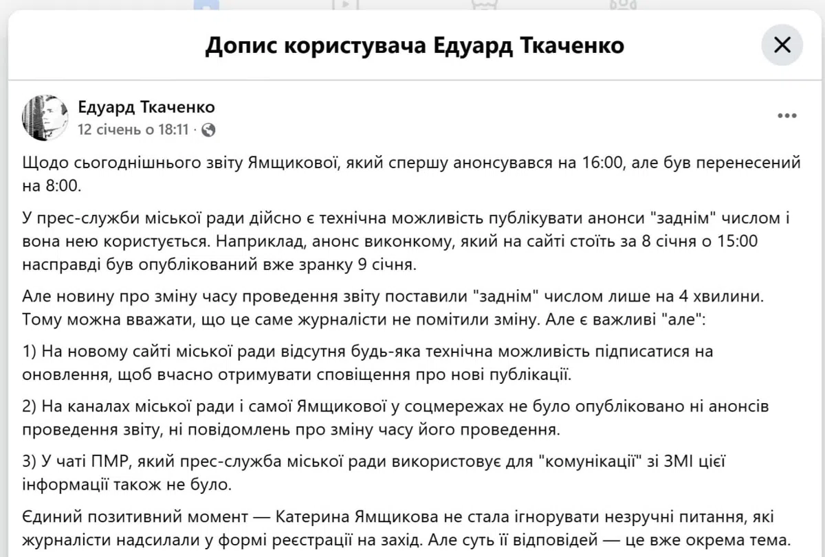 “Я побачила офіційну новину на сайті Полтавської міськради ще 8 січня, зареєструвалася. Тому всі публікації з телеграм-каналів на кшталт того, що “журналістів не пускали”, “провели звіт таємно, закрито”, можна назвати маніпулятивними. Частина неуважних журналістів, які пропустили зміну дати, почали перекладати відповідальність на колег та пресслужбу, а також намагатися знайти підтвердження своїй неуважності у вигляді публікації новини заднім числом (для розуміння, цю новину про зміну часу поставили “заднім” числом лише на 4 хвилини), як це було минулого року, - каже Анна Зарудська.