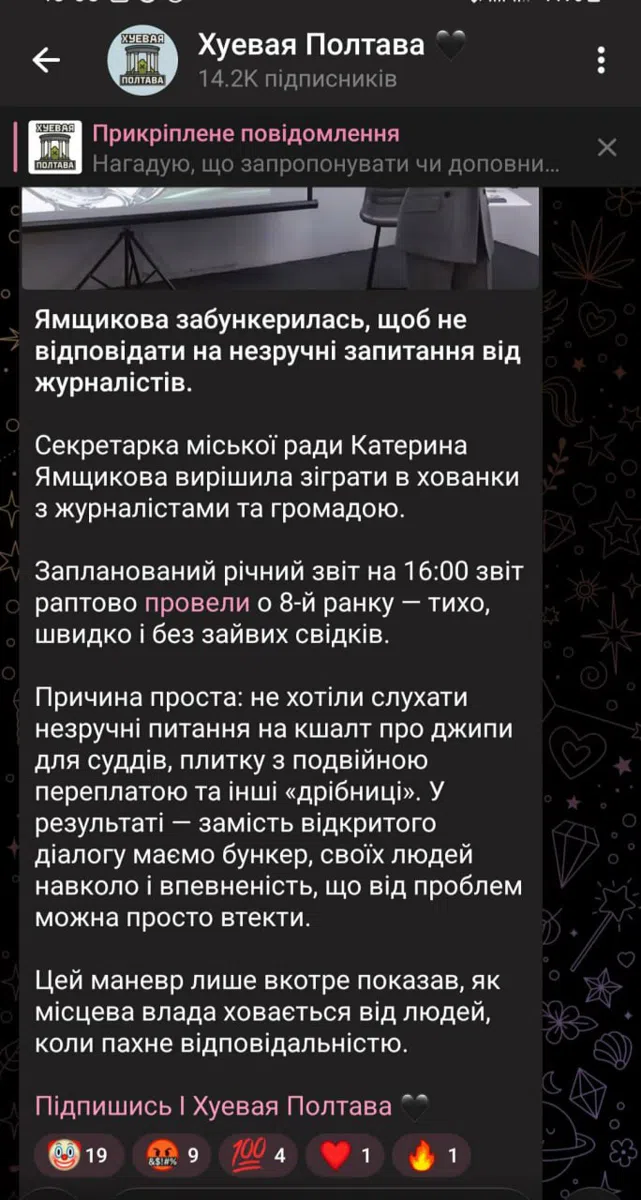 Місцеві анонімні телеграм-канали почали писати, мовляв, Ямщикова провела звіт таємно, щоб не відпоідати на незручні запитання журналістів. Скриншот з телеграм-каналу “Ху@@ Полтава”.