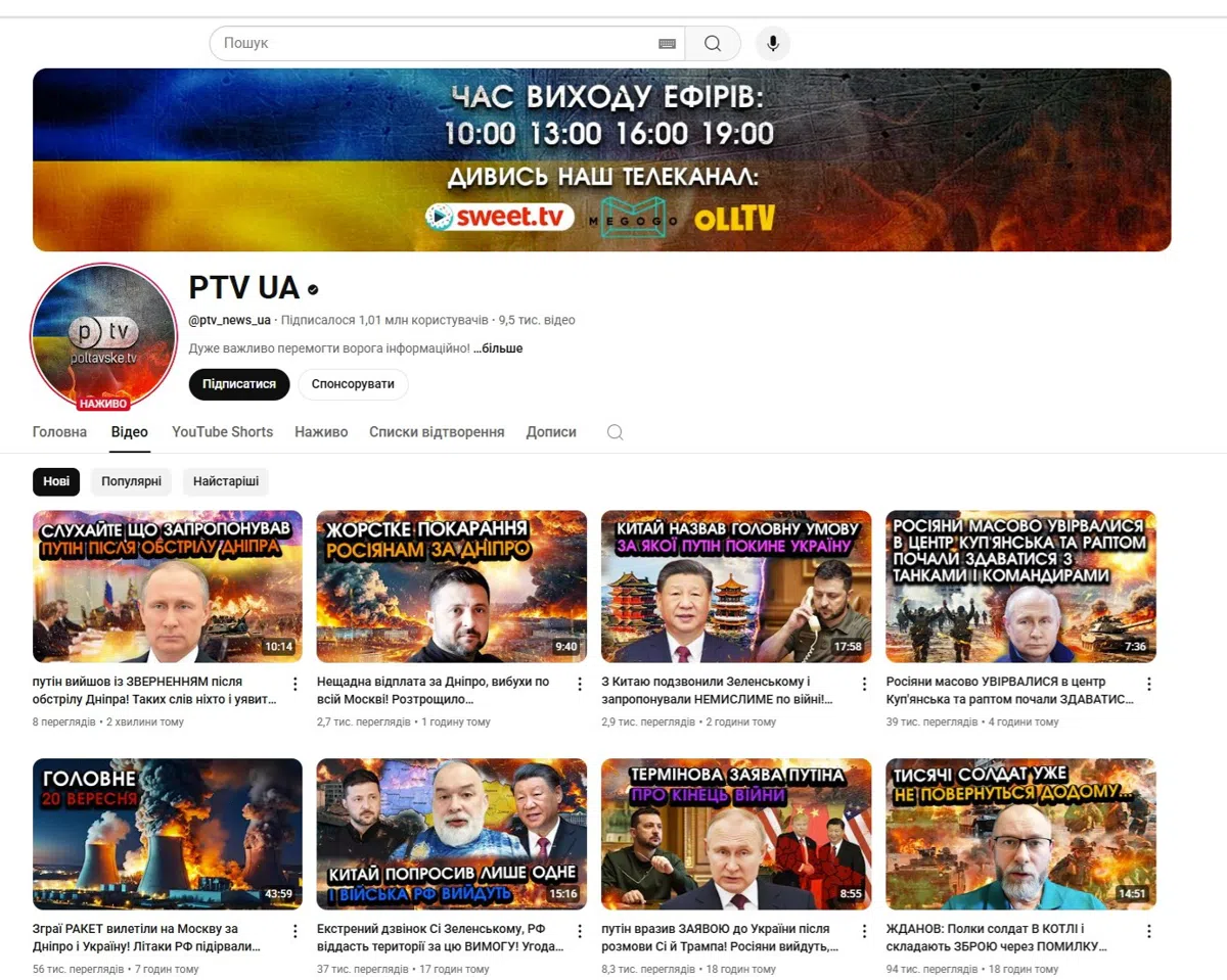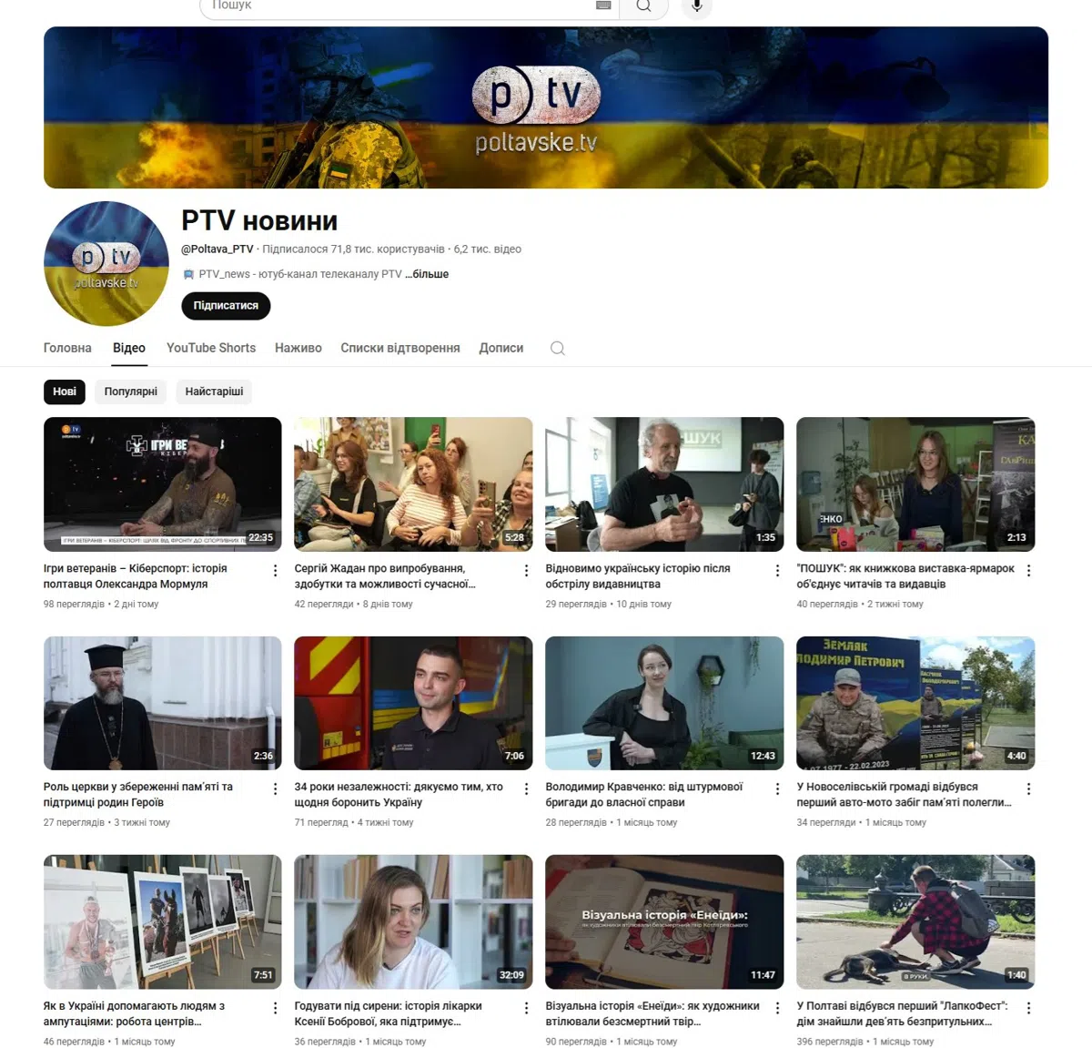 Лідером серед медіа за кількістю підписок у Полтаві є телеканал PTV UA (1,01 млн підписників). Як повідомляв “Детектор медіа” з посиланням на агентство Tyshchuk Digital HUB, PTV UA за проведеним у липні цього року дослідженням потрапив у рейтинг 50 українськомовних інформаційних ютуб-каналів на основі кількості переглядів та посів сьому сходинку.