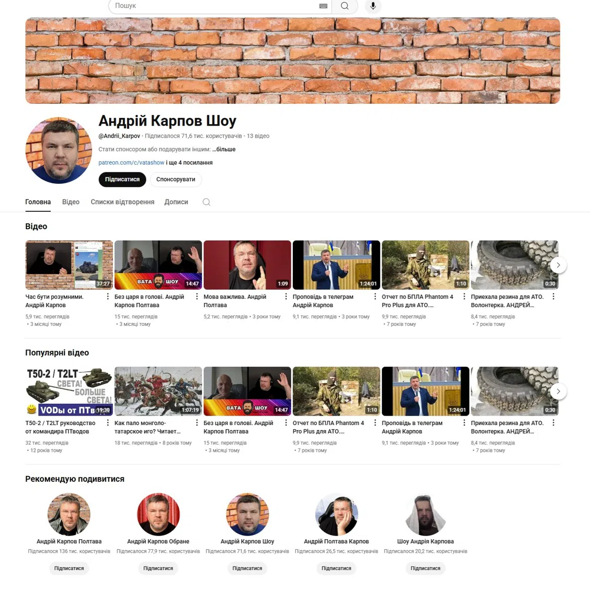 Є ще один канал Карпова, останнє оновлення на ньому було три місяці том. У ньому публікується авторський аналіз подій в Україні та світі. Загалом ми знайшли щонайменше п'ять YouTube-каналів, які належать або можуть належати Карпову