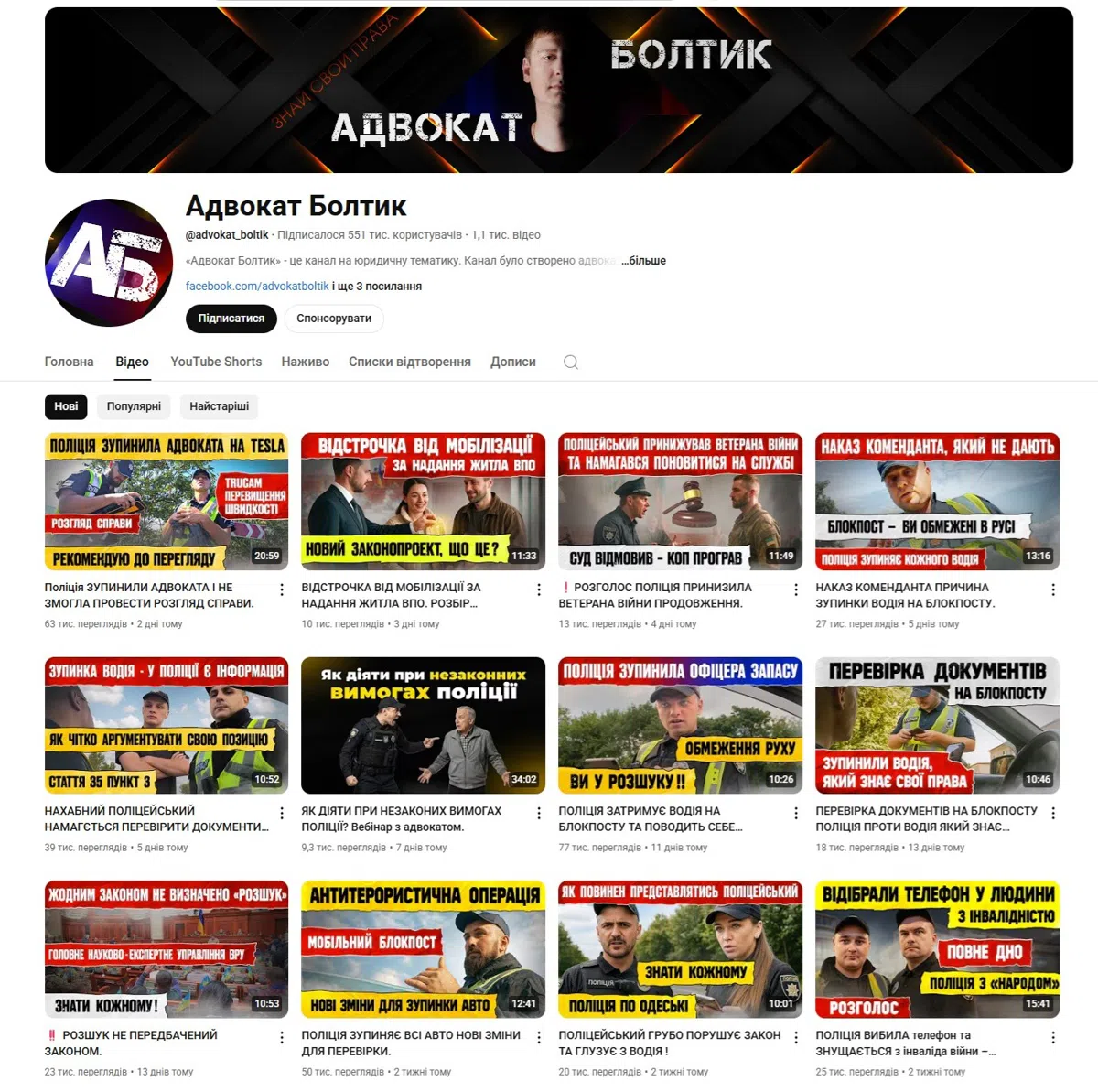 Так, полтавський адвокат Антон Болтик створив свій YouTube-канал у листопаді 2018 року і має 551 тисяч підписників.