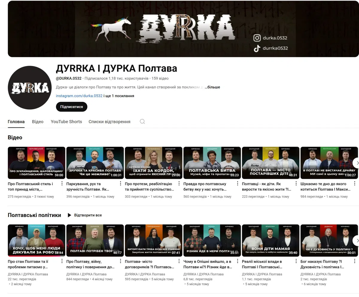 А тепер вітаємо, ви каналі полтавської “Дурки”. І це не жарт. Піарник, політичний консультант Артем Кіріченко та лікар-психотерапевт, психіатр, кандидат медичних наук Максим Закладний запустили у листопаді 2024 року YouTube-канал “ДУRRКА І ДУРКА Полтава”, який нараховує 1180 підписників.