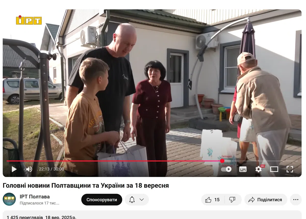 Реклами у сюжетах на жодному із проаналізованих телеканалів у YouTube ми не зафіксували, але помітили, що на телеканалі “ІРТ-Полтава” події часто коментують депутати Полтавської міськради, а не, приміром, профільні керівники комунальних установ. До прикладу, у сюжеті від 22 вересня про ремонт доріг в Полтаві коментар дає депутат міськради від “Слуги народу” Юрій Бражник. А у сюжеті про головні події 18 вересня з'являється Валерій Пархоменко, перший заступник міського голови Полтави, який вручає дітям подарунки. І ось тут є нюанс, який має ознаки рекламис про джинсу: Пархоменко вручає пакунки не з логотипом, наприклад, міської ради, а власної агітаційної програми “Пархоменко за Полтаву”.