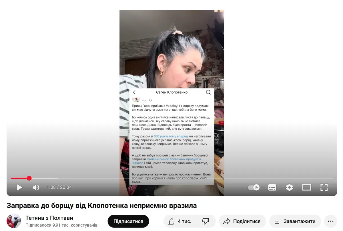 Наприклад, в одному із нещодавніх відео вона варила борщ із заправкою бренду відомого українського кулінара Євгена Клопотенка, обговорювала приїзд принца Гаррі до України і зустріч Клопотенка з ним та радила останньому “не лізь до українських страв, ти їх паскудиш, дурак”.