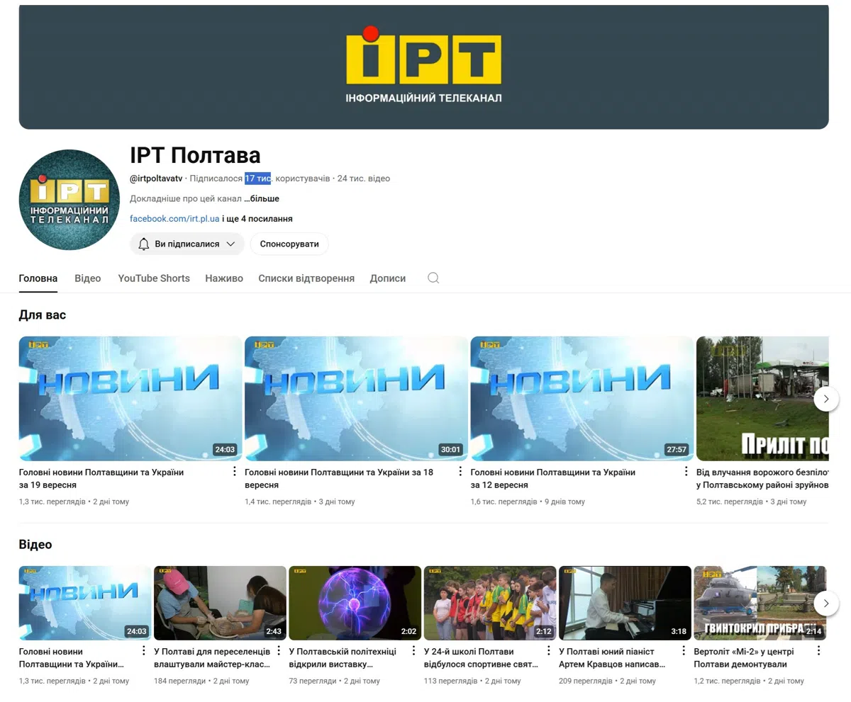 Телеканал “ІРТ-Полтава” також публікує на YouTube-каналі сюжети з основного сайту. Наприклад, про врятованих від браконьєрів лебедів 17 вересня, закупівлі, культуру тощо. Щодня публікують випуски новин “Головні новини Полтавщини та України “.