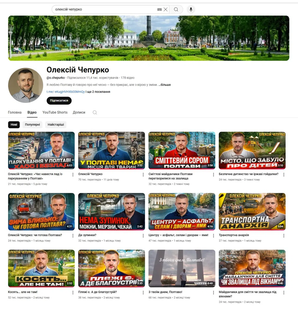 Також активно займається блогерською діяльністю Олексій Чепурко, депутат та заступник голови Полтавської обласної ради, в минулому - депутат Полтавської міськради, теж заступник міського голови. Обидва активно ведуть свої сторінки в майже всіх соцмережах, та зупинимося на аналізі контенту YouTube-каналів. Відео Пархоменка і Чепурка мають спільне: канали почали працювати минулого року майже одночасно, з різницею в кілька місяців. Обидва мають або мали відношення до міської влади і обидва, при цьому, будують свої блоги на її критиці. Контент знятий професійно, відео - короткі.