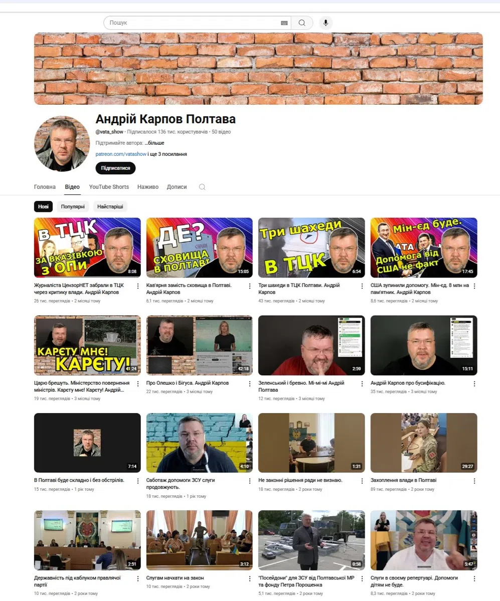 Ще один відомий політик-ютюбер у Полтаві - теж депутат Полтавської міськради, колишній секретар ради Андрій Карпов. До того, як він став депутатом міськради в 2021 році, Карпов був відомий як “Андрій Полтава” та своїм “ВатаШоу”, в якому він в чат-рулетці спілкувався з росіянами, вів прямі трансляції, на яких говорив на суспільно-важливі теми. Канал Карпова створений у серпні 2017 року та нараховує 136 тисяч підписників. На момент підготовки блогу до публікації відомо, що наразі Карпов не оновлює свій канал протягом останніх двох місяців.
