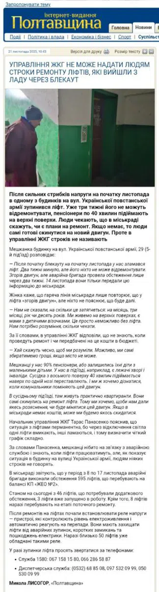 Днями на офіційному телеграм-каналі управління ЖКГ Полтавської міської ради з'явився допис, в якому управління закликає не поширювати недостовірну інформацію та спиратися лише на офіційні повідомлення щодо ремонту ліфтів у місті. Це, як розповіли в редакції, була реакція на матеріал “Полтавщини” “Управління ЖКГ не може надати людям строки ремонту ліфтів, які вийшли з ладу через блекаут”. Дискусія про це виникла у робочому чаті комунікації медійників з міською радою, але офіційних заяв від міської ради щодо публікації поки що не було. Журналісти запевняють, що інформація достовірна і вони її отримали від мешканців будинку, про який пишуть.