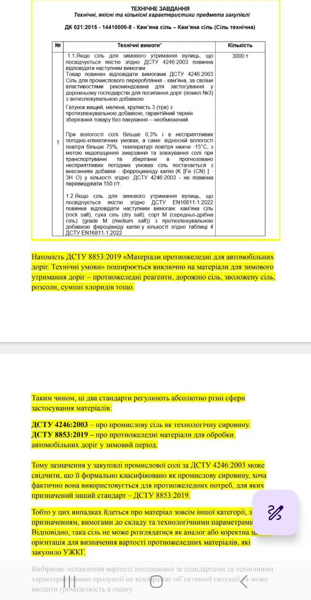 У зв’язку з цим будь-які спроби порівнювати ціну на кам’яну сіль, виготовлену відповідно до ДСТУ 8853:2019, з вартістю інших видів солі, які виробляються за зовсім іншими стандартами (зокрема, ДСТУ, що застосовуються для солі харчової, технічної, кормової або промислової), є абсолютно некоректними та технічно необґрунтованими. Бо вона має інше цільове призначення, інший хімічний склад та вміст домішок, інші вимоги щодо сировини та обробки й відсутність спеціальних добавок або їх невідповідність вимогам дорожньої галузі”, – йдеться в роз'ясненні.