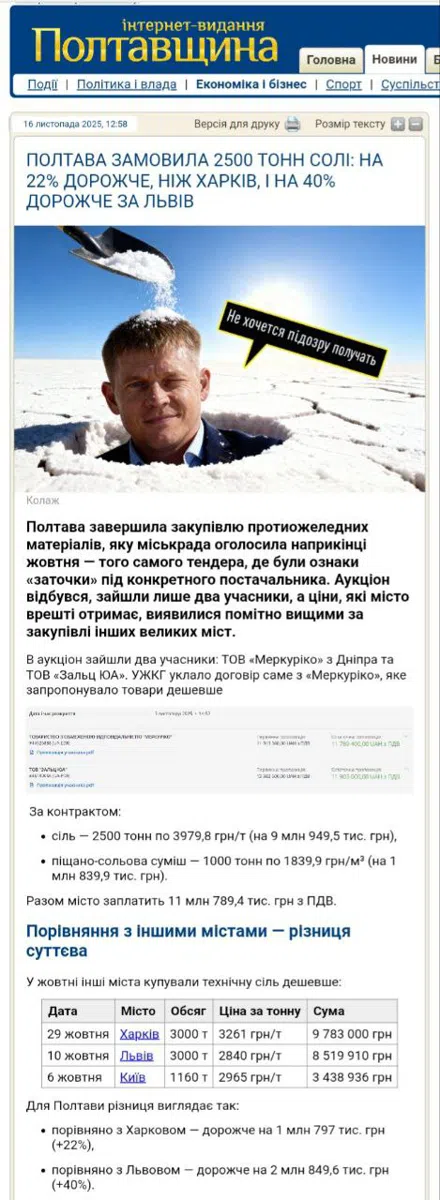 За даними журналістів, на аукціон закупівлі солі зайшли лише два учасники, а ціни, які місто врешті отримає, виявилися помітно вищими за закупівлі інших великих міст. Скриншот з сайту “Полтавщина”