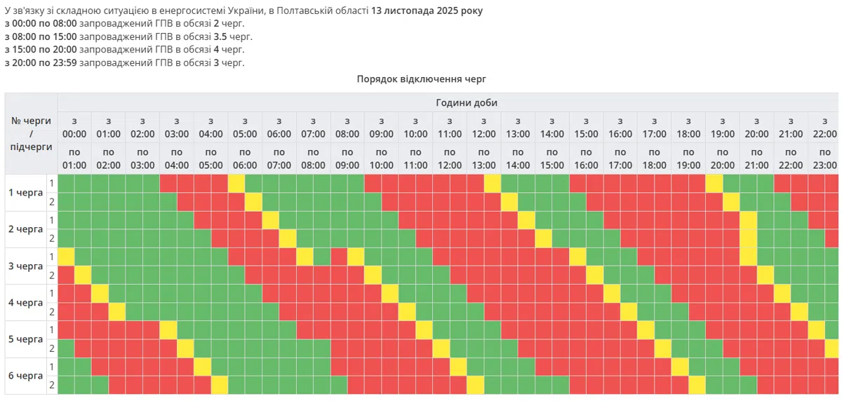 13 листопада у Полтавській області введуть графіки погодинних відключень електроенергії. Їх запроваджують через дефіцит потужності в енергосистемі, через обстріли рф. Про це повідомили на сайті "Полтаваобленерго".