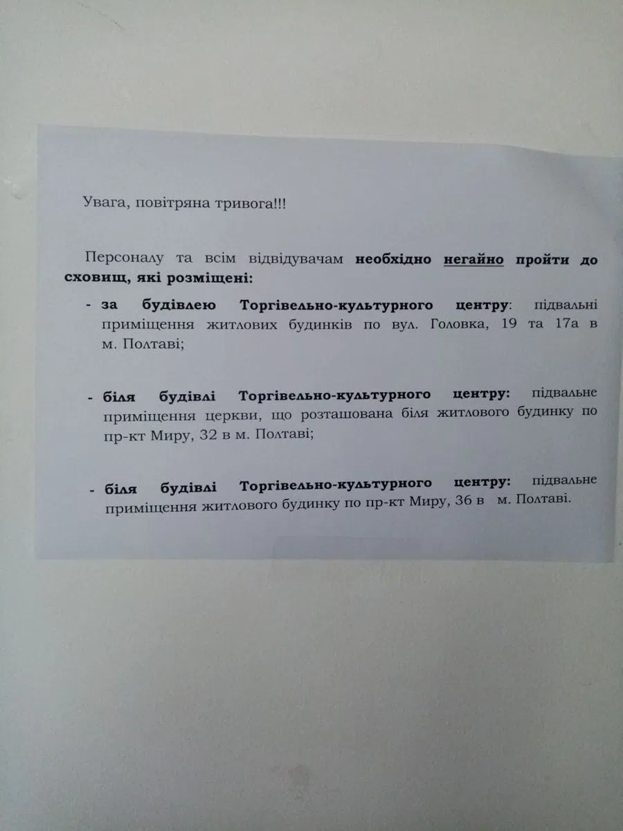 "Ми не маємо власного укриття, тому ми домовилися аби люди з ТЦ могли спокійно йти до найближчих багатоповерхових будинків та церкви. Там їх радо приймають, тож у місцях найбільшого скупчення відвідувачів ми розмістили оголошення куди з адресами цих укриттів а також розмістили вказівники для безпечної евакуації сходами", - повідомила керуюча ТЦ.