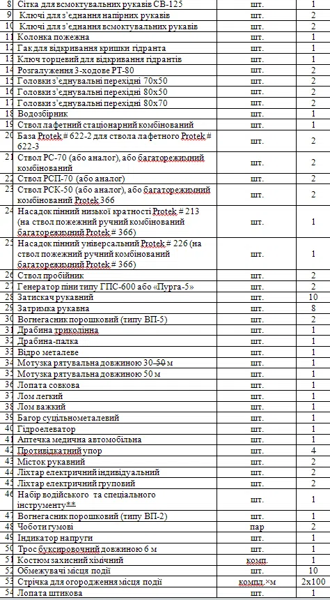 Згідно з тендерною документацією, має бути таке пожежно-технічне озброєння та аварійно-рятувальне обладнання: