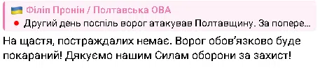 За інформацією начальника Полтавської військової адміністрації Філіпа Проніна, є влучання в промисловий обʼєкт.