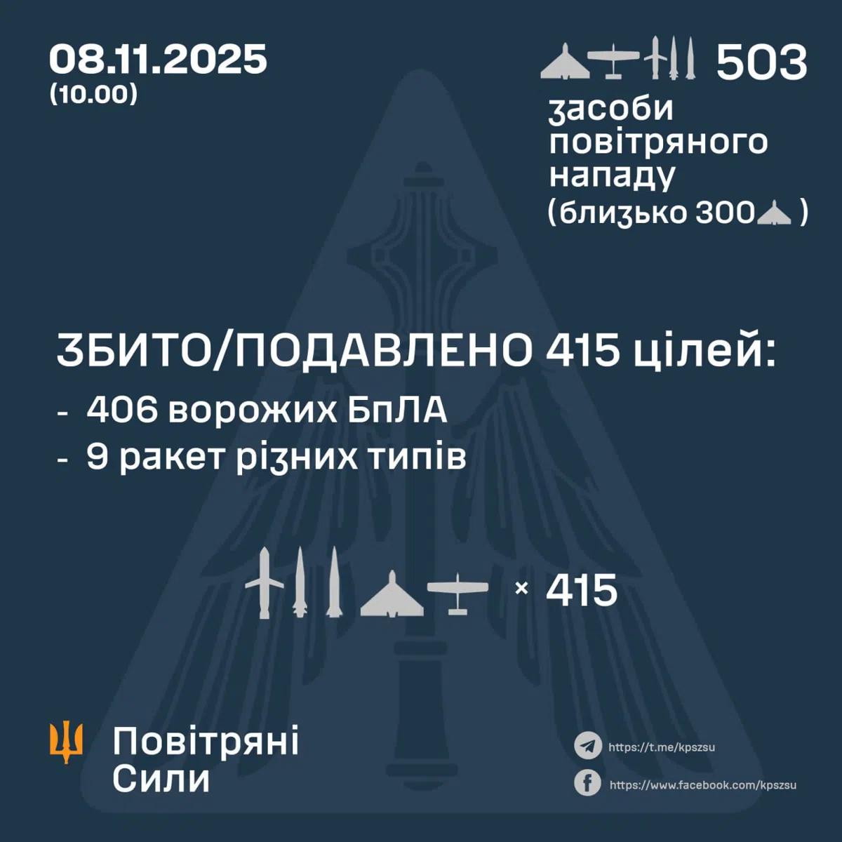 За офіційними даними, в ніч з 7 на 8 листопада росіяни випустили по Україні понад 450 дронів і 45 ракет різних типів.