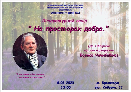 У Кременчуці до 100-річчя від дня народження поета Бориса Чичибабіна відбудеться літературний вечір