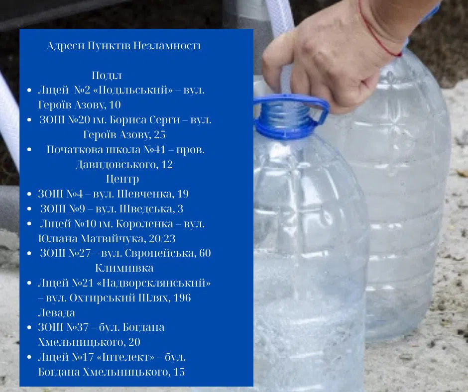Загалом, у зоні відключення будуть працювати десять пунктів незламності до яких підвозитимуть питну та технічну воду за графіками, які будуть розміщені на територіях мікрорайонів.